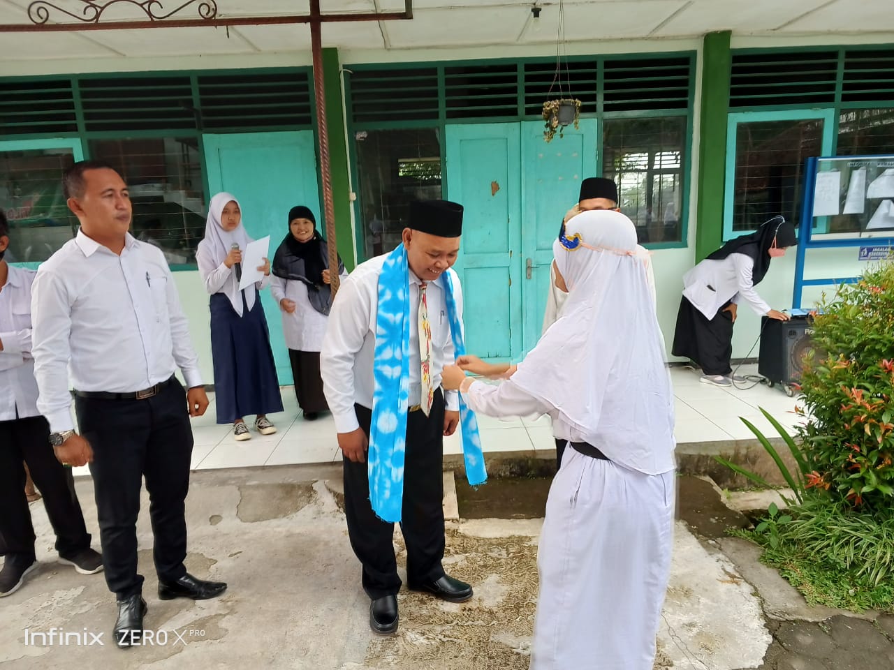 Sleman (MTsN 7 Sleman) – Setelah beberapa waktu yang lalu MTsN 7 Sleman mengantarkan Kepala Madrasah yang lama ke tempat tugas yang baru. Sekarang, giliran MTsN 7 Sleman menyambut kedatangan Kepala MTsN 7 Sleman yang baru yaitu Bapak Samsul Arifin, S.Ag. menggantikan Ibu Dra.Titik Susilawati,M.Pd yang pindah tugas menjadi Kepala MTsN 2 Sleman, Selasa (8/3/2023). Bertempat di Gedung Aula MTsN 7 Sleman acara penyambutan diawali dengan Tarian Harmoni Nusantara oleh peserta didik MTsN Sleman sekaligus pengalungan cinderamata berupa batik Sibori karya dari peserta didik yang berlangsung secara hikmat. Para guru MTsN 7 Sleman beserta peserta didik berbaris rapi menyambut rombongan dari MTsN 2 Sleman, instasi Bapak Samsul Arifin S.Ag. berasal, mulai dari gerbang madrasah hingga di dalam Aula Madrasah.