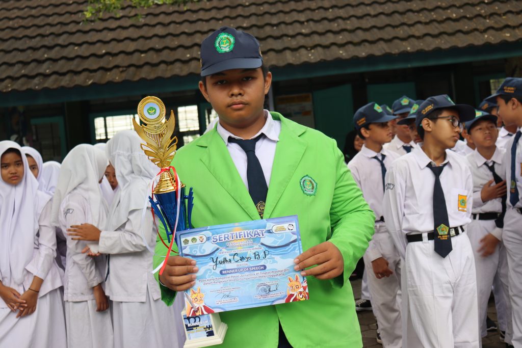 Warta Santun (MTsN 7 Sleman) – Prestasi gemilang kembali ditorehkan oleh Yudha Cahyo Bolodenka Purwanto peserta didik kelas IX C yang berhasil membawa pulang prestasi membanggakan dengan meraih juara 2 English Speech Contest dalam kompetisi Jurnalistik #1 dalam rangka Alnesa Competition di MAN 1 Yogyakarta. Suasana meriah memenuhi lapangan MAN 1 Yogyakarta saat Awarding dan Closing Alnesa Competition 2025 digelar pada Minggu (9/2/2025). Acara penutupan ini dimeriahkan oleh berbagai penampilan istimewa, termasuk hadroh, lagu solo, serta tarian Ratoe Alisa yang memukau para hadirin. Pada acara yang diselenggarakan oleh MAN 1 Yogyakarta ini , Yudha tampil dengan percaya diri di depan video yang dibuatnya sehingga membuat juri terpesona melihat penampilan yang begitu enerjik dan percaya diri.