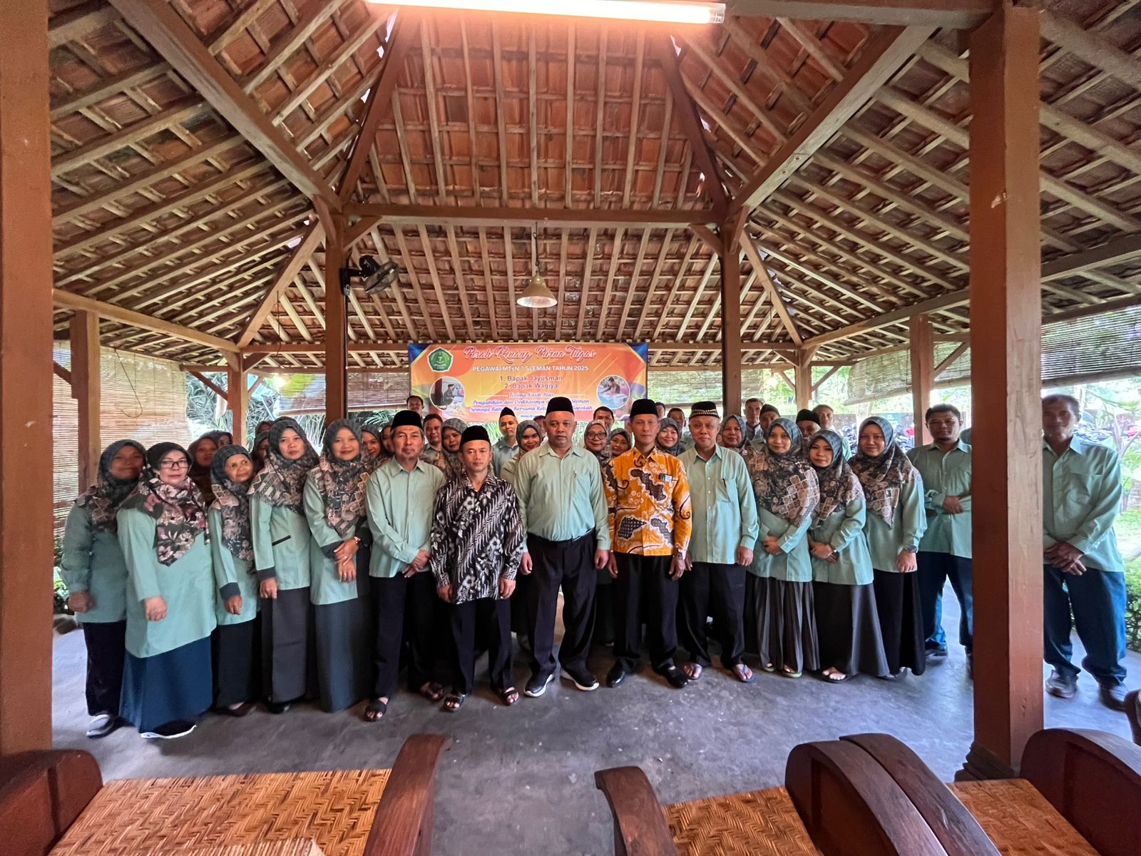 Warta Santun (MTsN 7 Sleman) - Acara perpisahan purna tugas guru dan pegawai adalah momen penting untuk menghormati dan mengapresiasi pengabdian seorang guru yang telah memasuki masa purna tugas. Diawali dengan makan siang bersama MTsN 7 Sleman mengadakan acara pelepasan Pegawai Tata Usaha MTsN 7 Sleman atas nama Jayusman dan Wagiya yang bertempat di Pendopo Erista Kaliaji pada Jum’at (18/7/2025). Jayusman telah memasuki masa pensiun terhitung mulai tanggal 1 April 2025 dan Wagiya pada tanggal 1 Juli 2025. beliau berdua merupakan pegawai tata usaha MTsN 7 Sleman.
